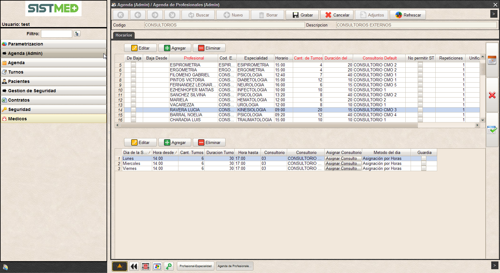 Permite definir diferentes centros médicos y para cada uno los diferentes consultorio o sala de estudios. Permite gestionar a los profesionales por especialidad. Permite gestionar las agendas de médicos o de estudios de forma ágil y dinámica. Permite generar agendas de forma automática, realizar cancelación de turno, gestionar agendas esporádicas, ingresar sobre turnos y la unificación de agendas.