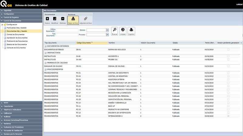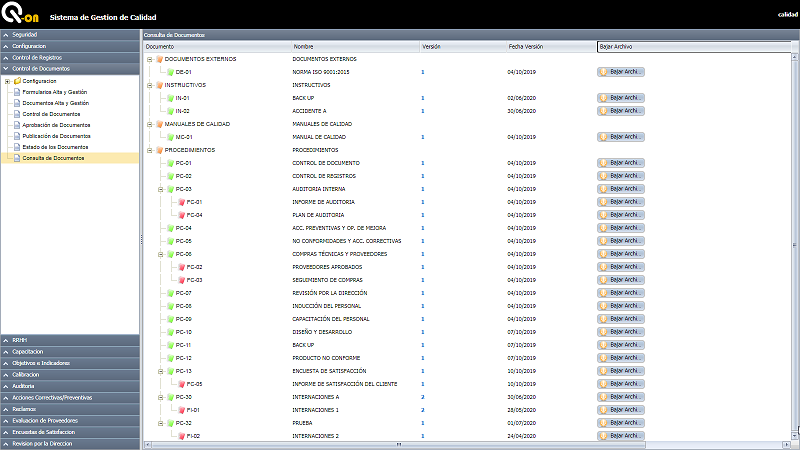 Permite definir los distintos tipos de documentos y formularios utilizados en el SGC. Permite la elaboración de documentos, gestionando su creación, control y aprobación, integrando además un sistema de notificaciones digitales por e-mail que facilita la comunicación a los diferentes usuarios. Consultar el histórico, versiones anteriores y emitir distintos tipos de reportes.