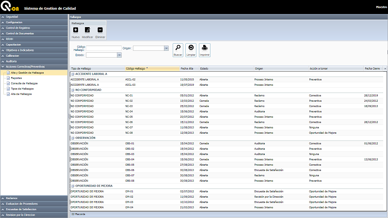 Permite registrar y realizar el tratamiento, seguimiento y cierre de las acciones correctivas, preventivas u oportunidad de mejora. Permite definir los tipos de hallazgos establecidos por la organización como por ejemplo Observación, No Conformidad, Accidente, etc. Permite registrar el origen de las mismas y a su vez relacionarlas con auditorias, Reclamos, Procesos internos, Revisiones de la Dirección, etc. También permite realizar la registración de la verificación de la eficacia, fechas y responsables por la acción tomada. Permite emitir distintos tipos de reportes.